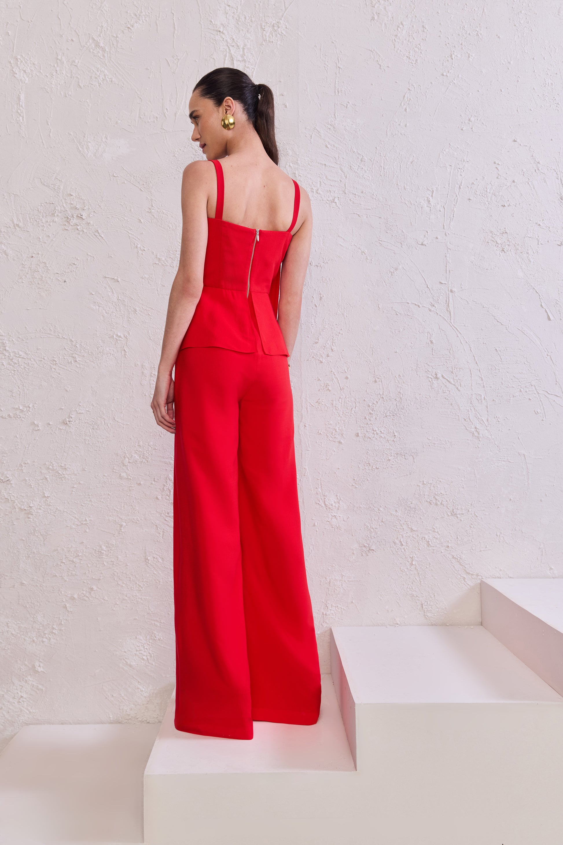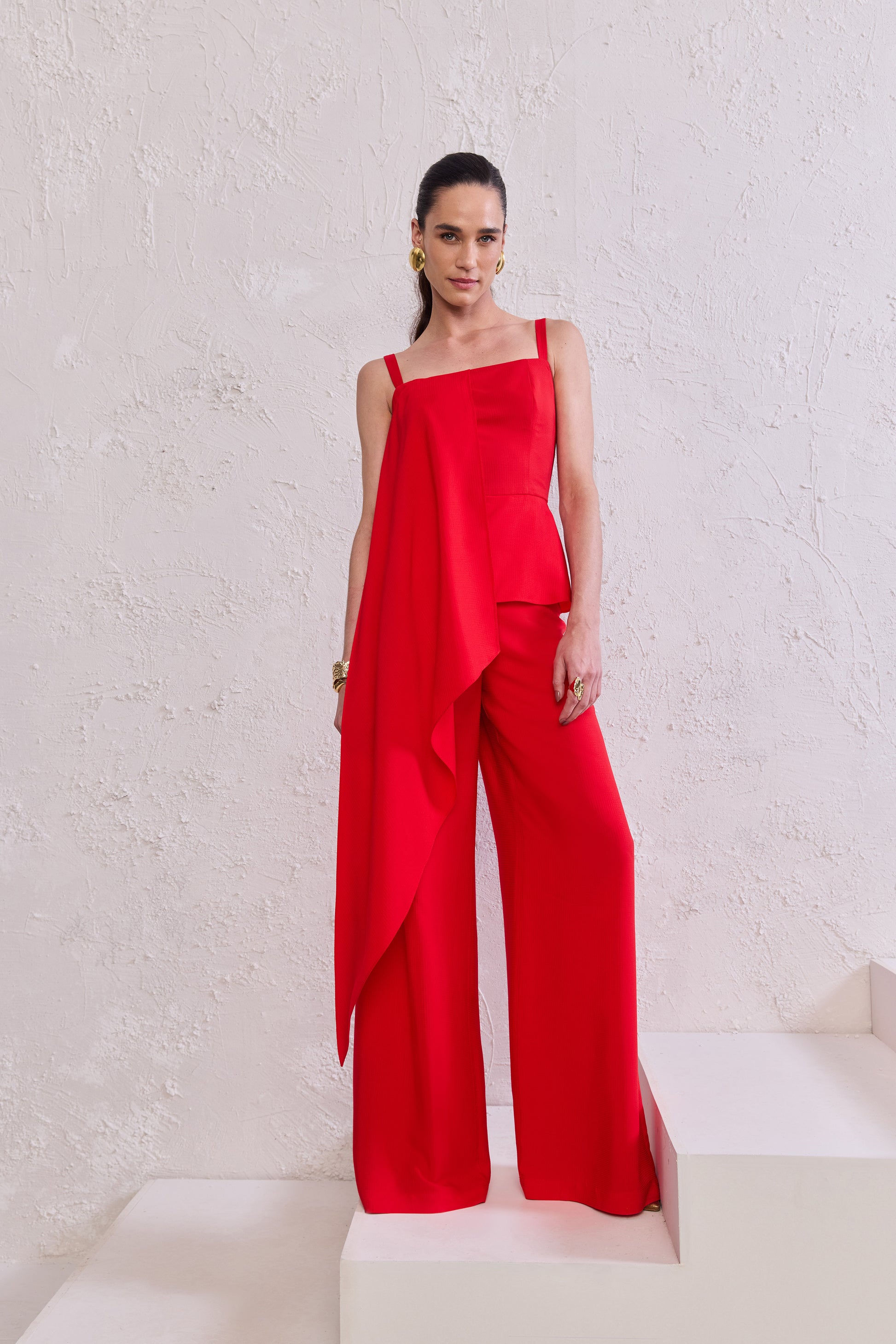 A calça de modelagem ampla e fluida proporciona liberdade total de movimento, criando uma silhueta alongada e elegante. O fechamento posterior por zíper invisível garante um ajuste preciso e confortável, realçando o caimento da peça.